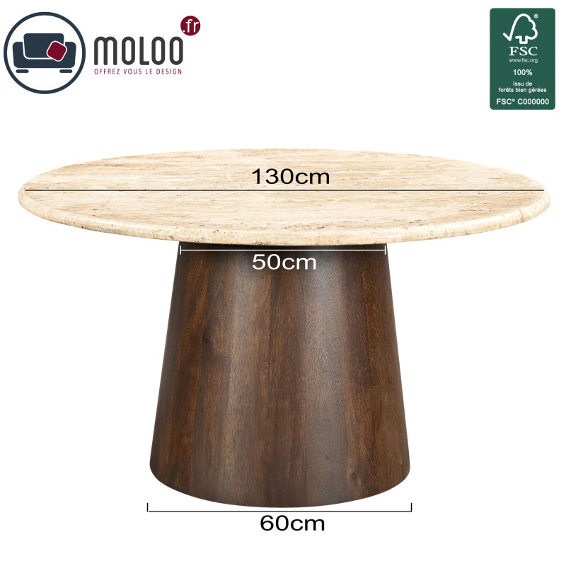 La table repas présentée dispose d'un plateau en diamètre 130 cm.