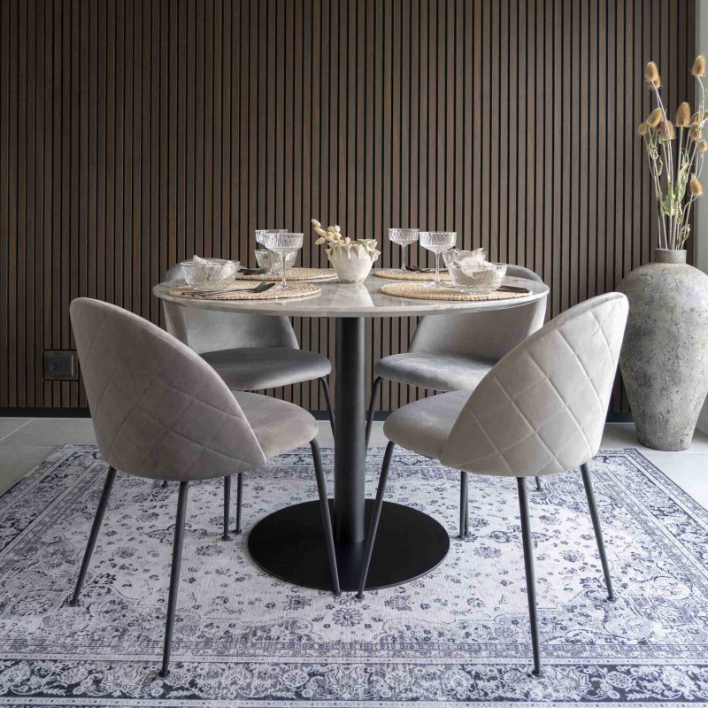 Contraste contemporain. Cette table ronde allie la sophistication de l'effet marbre au minimalisme du piètement en métal noir. L'alliance parfaite de la matière et de la ligne pour un espace moderne et épuré.