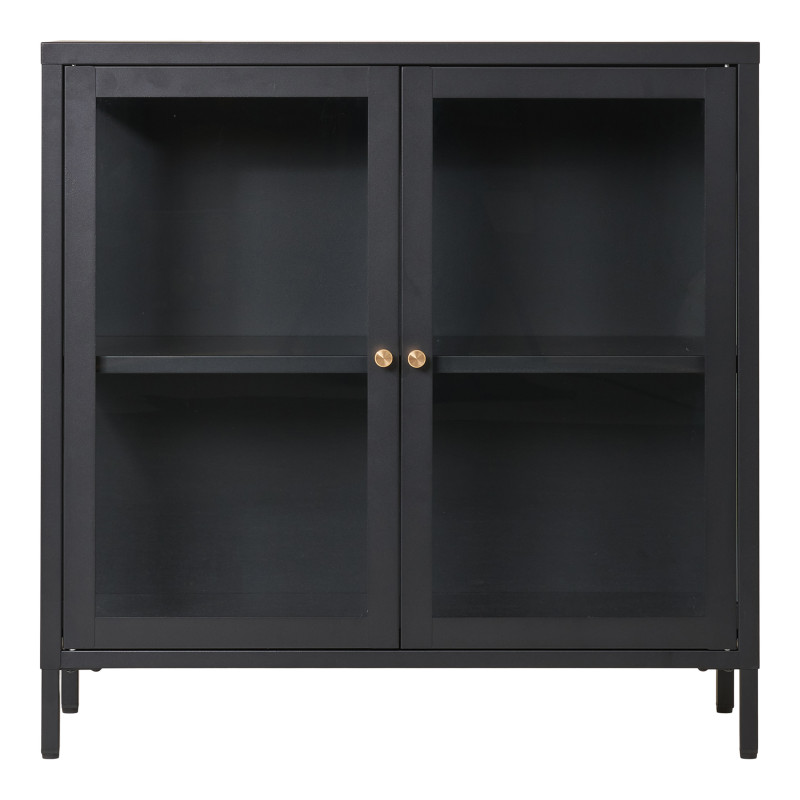 Contrasto industriale. Questo mobile contenitore quadrato in metallo nero mette in mostra il suo contenuto dietro due ante in vetro. L'elegante stile industriale è perfetto per un soggiorno moderno. La combinazione perfetta di materiali e linee per uno stile audace.