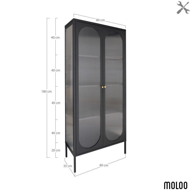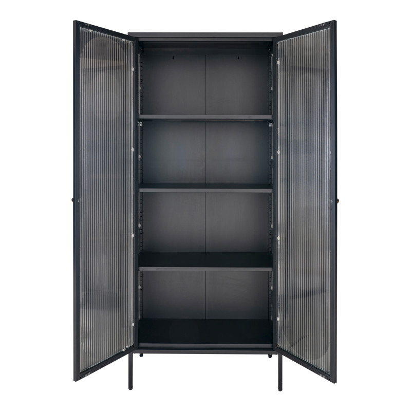 Collezione RETRO: Vetrina alta a 2 ante con vetro ondulato Volume ed eleganza. Questa grande vetrina in acciaio nero e vetro ondulato massimizza lo spazio. La sua altezza e il design retrò-chic la rendono il fulcro del soggiorno. La combinazione perfetta di materiali e linee per un interno strutturato.