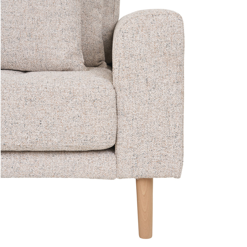 Luminosità scandinava. Questo divano angolare in tessuto beige con chaise longue a destra è ideale per interni luminosi e ordinati. La chaise longue invita al relax. La perfetta combinazione di tessuto e linee crea un ambiente sereno. Cuscini decorativi inclusi.