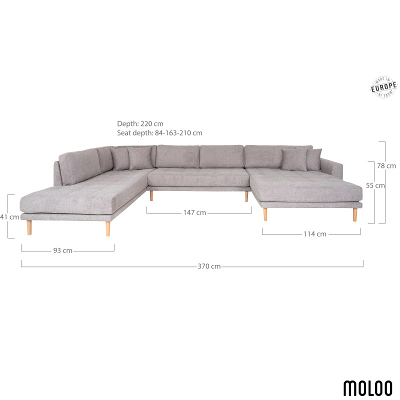 Ampio e accogliente. Questo divano panoramico in tessuto grigio combina una chaise longue a sinistra e un divano letto a destra. È perfetto per ospitare tutta la famiglia. Il suo colore intenso crea un'atmosfera calda. Il perfetto connubio tra materiale e design per un soggiorno extra-large. Cuscini decorativi inclusi.