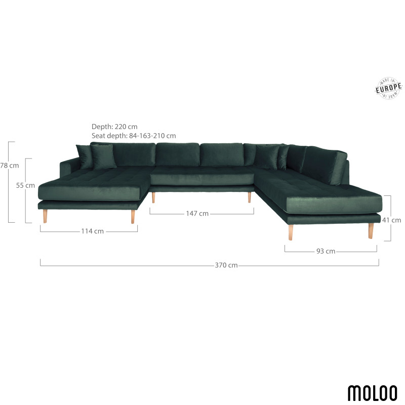 Ampio e accogliente. Questo divano panoramico in velluto verde pino combina una chaise longue a sinistra e una chaise longue a destra. È perfetto per ospitare tutta la famiglia. Il suo colore intenso crea un'atmosfera calda. Il perfetto connubio tra materiale e design per un soggiorno extra-large. Cuscini decorativi inclusi.