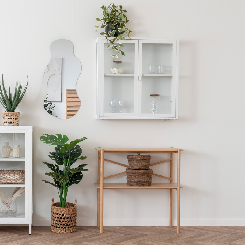 Collezione MAINe: Vetrina a parete con 2 ante bianche Leggerezza ed esposizione. Questa vetrina a parete in acciaio bianco con ante in vetro è perfetta per esporre i tuoi oggetti. Il suo design pulito e a parete crea un'illusione di leggerezza. La combinazione perfetta di materiali e linee per un interno arioso.