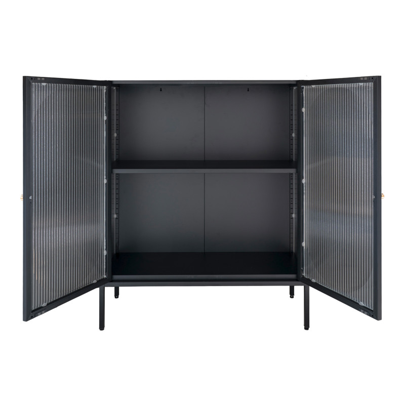 Collezione RETRO: Vetrina a 2 ante con vetro ondulato Contenitore di carattere. Questa vetrina in acciaio nero con due ante in vetro ondulato offre ampio spazio di archiviazione. Lo stile retrò si integra perfettamente in un interno contemporaneo. La combinazione perfetta di materiale e design per un mobile eccezionale.