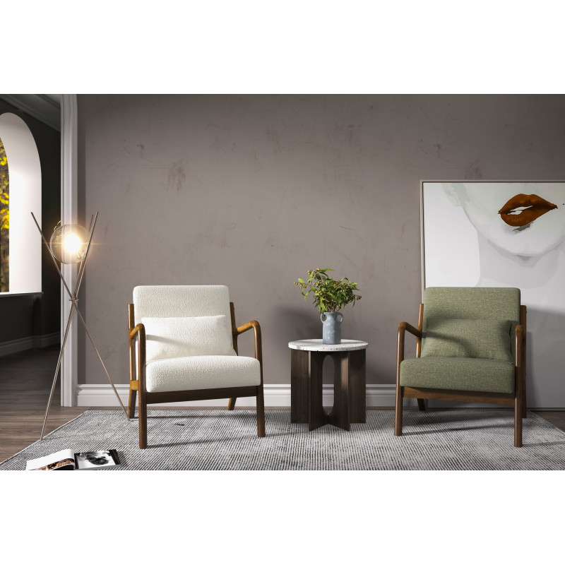 Versione presentata in legno tinta noce e tessuto Trendy Verde.