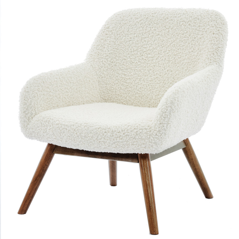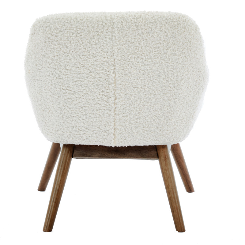 Versione presentata in tessuto bouclé écru e legno patinato noce.