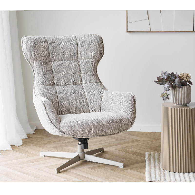 Collezione KARL: Poltrona in tessuto beige Comfort avvolgente. Questa poltrona in tessuto beige è un invito al relax. La sottile base in metallo garantisce un'elegante stabilità ed è girevole. La combinazione perfetta di materiale e design per un angolo accogliente.