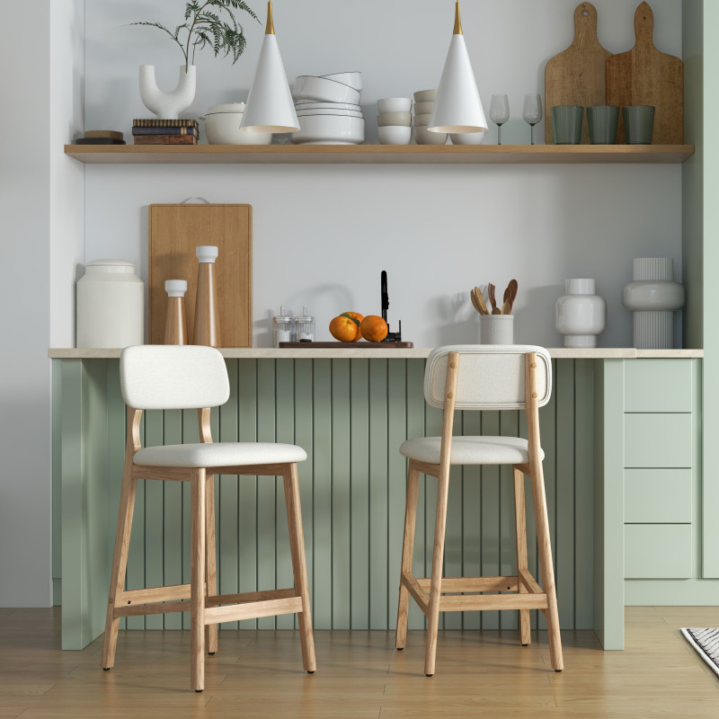La sedia da bar CLIFF in tessuto Trendy ha un'altezza della seduta di 65 cm, ideale per un'isola centrale della cucina.