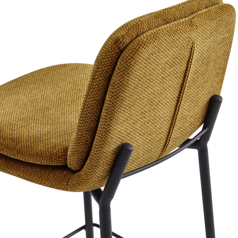 Ci piace particolarmente la sua base in metallo nero da 16 mm con gambe affusolate e inserti in metallo dorato spazzolato sullo schienale, il lavoro di cucito con la sua doppia imbottitura imbottita sul sedile e sullo schienale e rivestita con le tessuto Luxury Senape con l'etichetta Oeko-Tex.