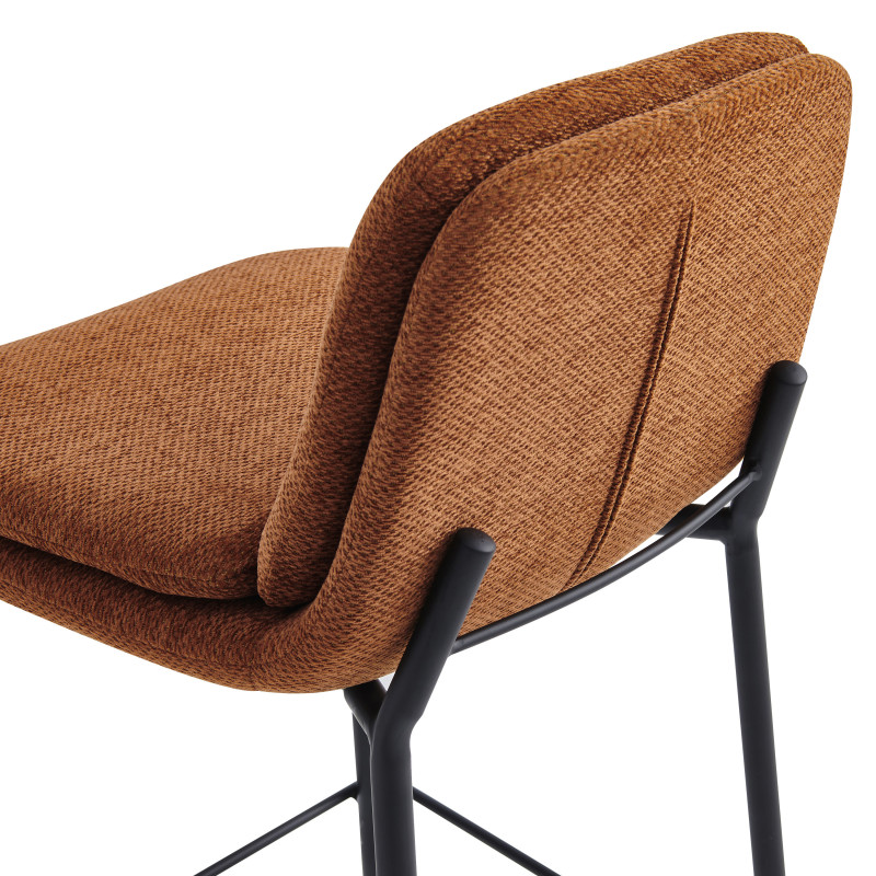Ci piace particolarmente la sua base in metallo nero da 16 mm con gambe affusolate e inserti in metallo dorato spazzolato sullo schienale, il lavoro di cucito con la sua doppia imbottitura imbottita sul sedile e sullo schienale e rivestita con le tessuto Luxury Terracotta con l'etichetta Oeko-Tex.