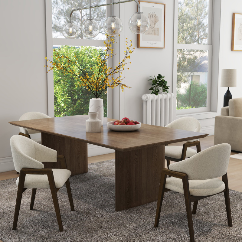 Versione presentata in frassino tinto noce e tessuto Curly Ecru.