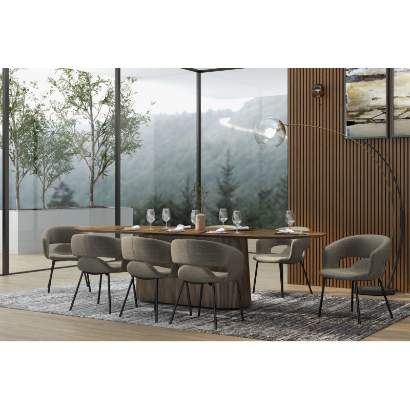Versione presentata in pregiato tessuto Luxury Marrone, certificato OekoTex e piedino in metallo con decoro rovere.