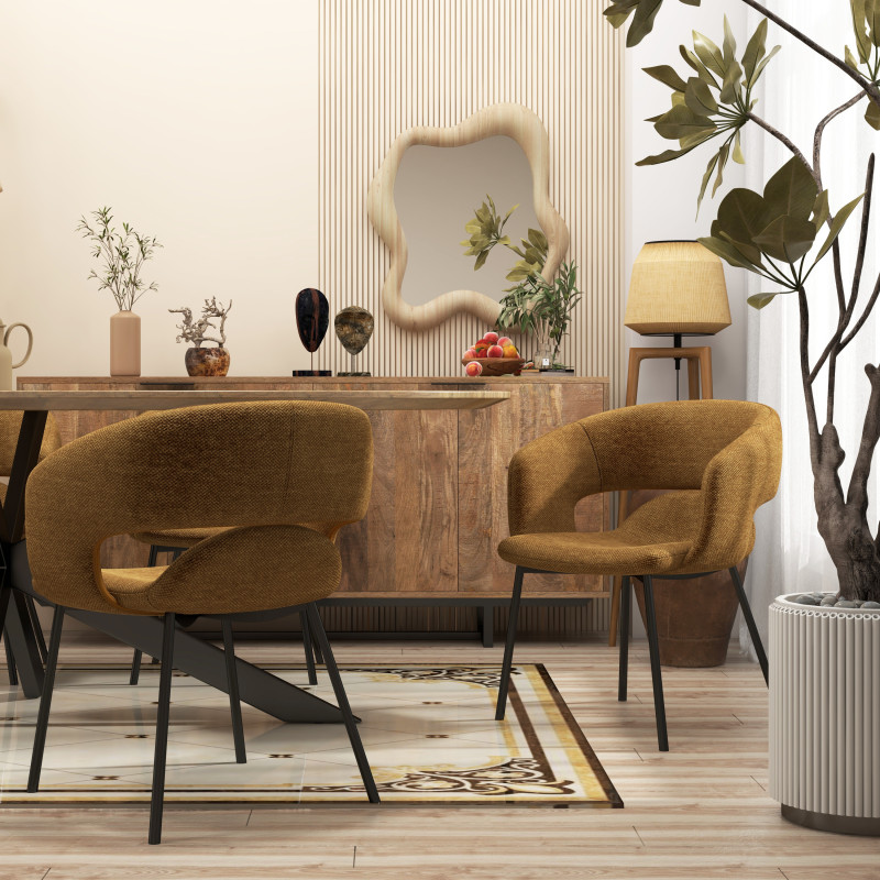 Versione presentata in pregiato tessuto Luxury Senape, certificato OekoTex e piedino in metallo con decoro rovere.