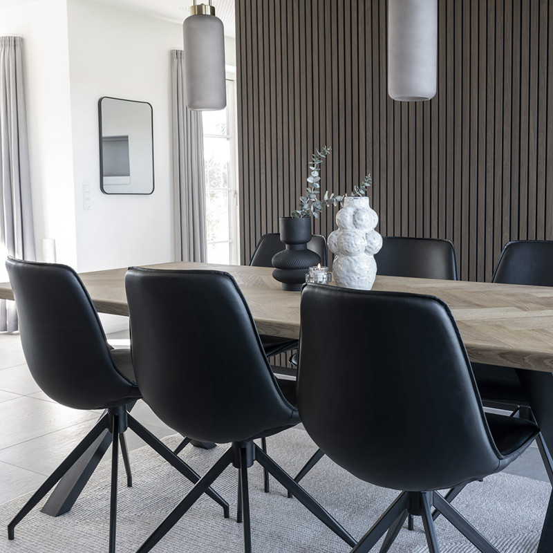 Design pulito. Questa sedia girevole in similpelle nera offre una silhouette moderna e rigorosa su una base in metallo. La rotazione a 360° garantisce libertà di movimento e un comfort ottimale. La combinazione perfetta di materiali e linee per uno stile distintivo.
