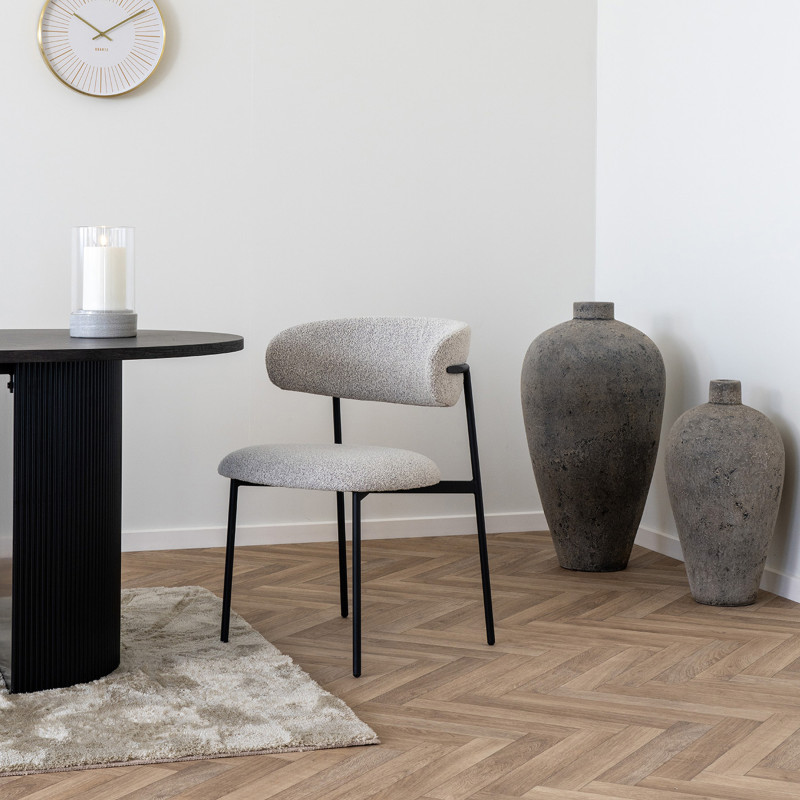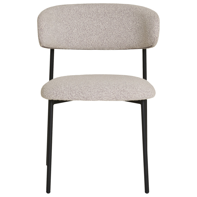 Delicatezza scandinava. Questa sedia in tessuto bouclé color sabbia offre una seduta comoda ed elegante. Le gambe in metallo nero creano un contrasto perfetto. La combinazione perfetta di materiale e design per creare uno spazio accogliente.