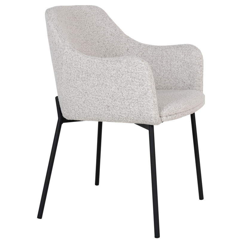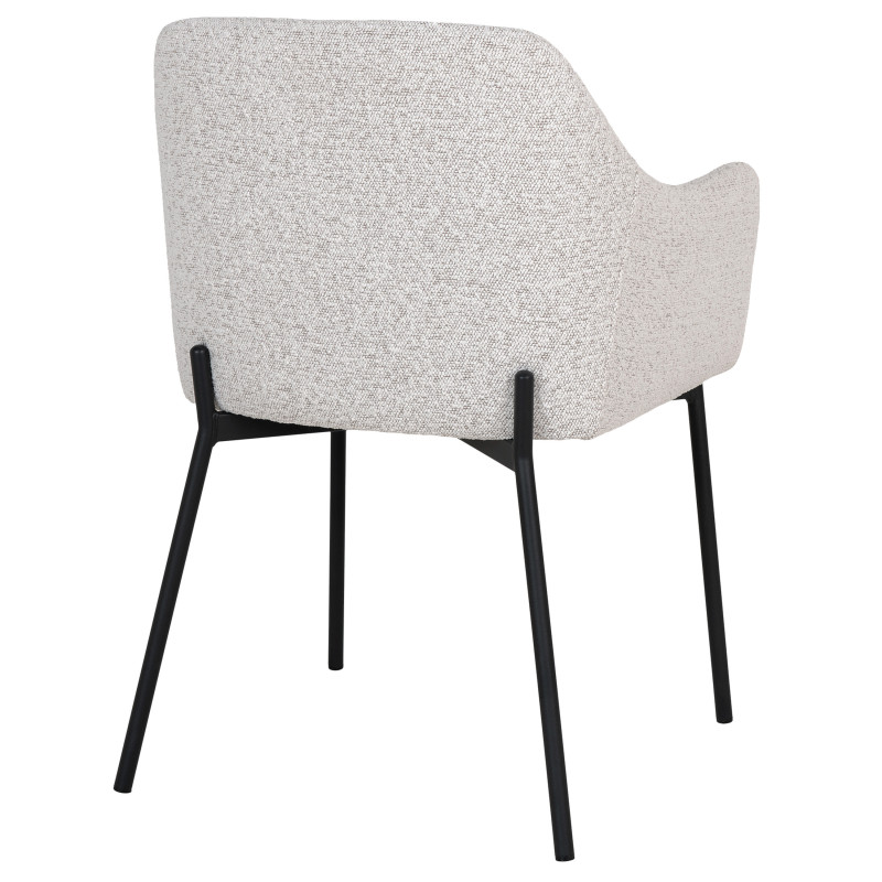 Texture elegante. Questa sedia da pranzo in bouclè écru unisce il comfort di una poltrona alla funzionalità di una sedia. La base in metallo nero aggiunge un tocco moderno. Il perfetto connubio tra materiale e design per una cena confortevole.
