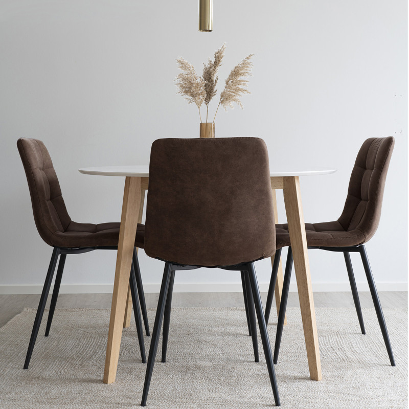 Collezione SVIN: Sedia Marrone Vintage Industrial Retro. Questa sedia in microfibra marrone vintage dona un tocco retrò alla tua tavola. Le gambe in metallo nero creano un contrasto perfetto. La combinazione perfetta di materiale e design per un'esperienza culinaria di stile.