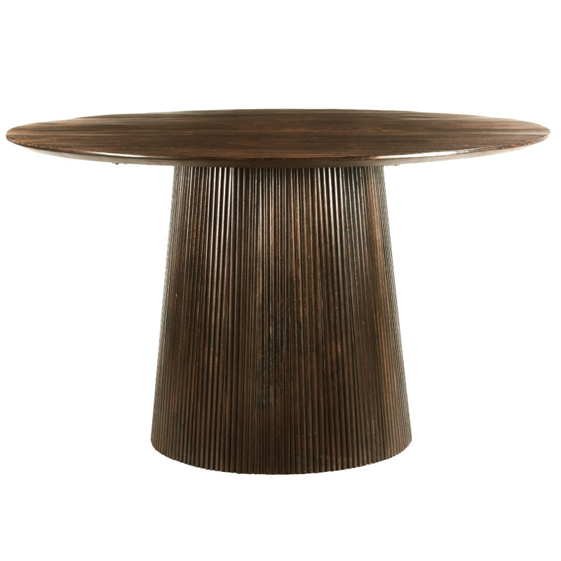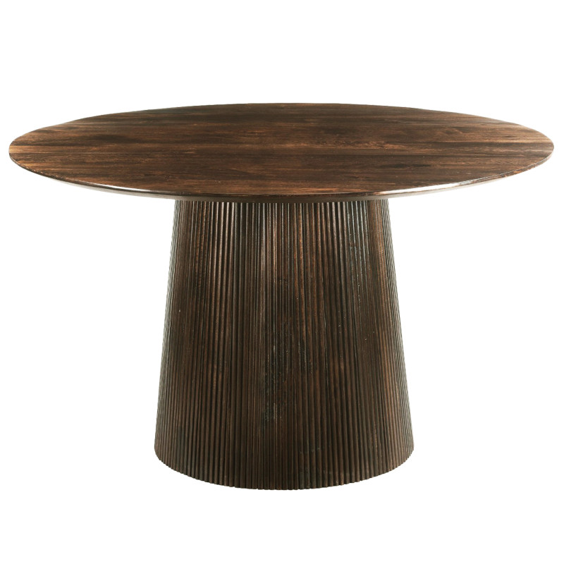 Il tavolo da pranzo rotondo per 4 persone presentato ha un diametro di 130 cm ed è realizzato in finitura marrone.