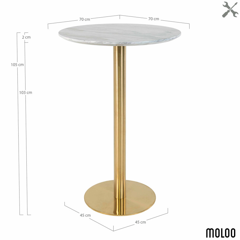 Altezza lussuosa. Questo tavolo da bar è un pezzo elegante, con piano effetto marmo e base in metallo con finitura ottone. La combinazione perfetta di materiale e design per un'area bar sofisticata.