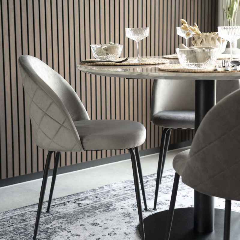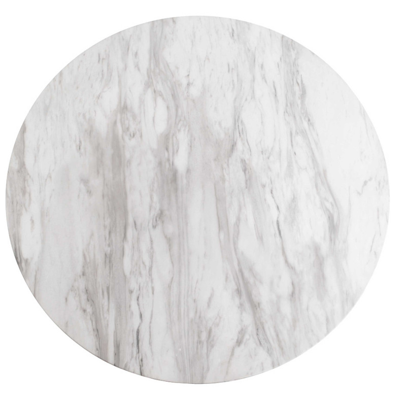 Un contrasto contemporaneo. Questo tavolo rotondo unisce la raffinatezza dell'effetto marmo al minimalismo di una base in metallo nero. Il perfetto connubio tra materiale e linee per un ambiente moderno e raffinato.