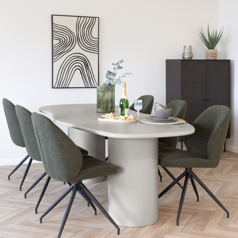 Collezione PAROS: Tavolo da pranzo in cemento Forza minerale. Questo grande tavolo asimmetrico in cemento è un pezzo di design dallo stile grezzo e industriale. La sua superficie effetto cemento è allo stesso tempo robusta e moderna. Il perfetto connubio tra materiale e linee per un interno contemporaneo.