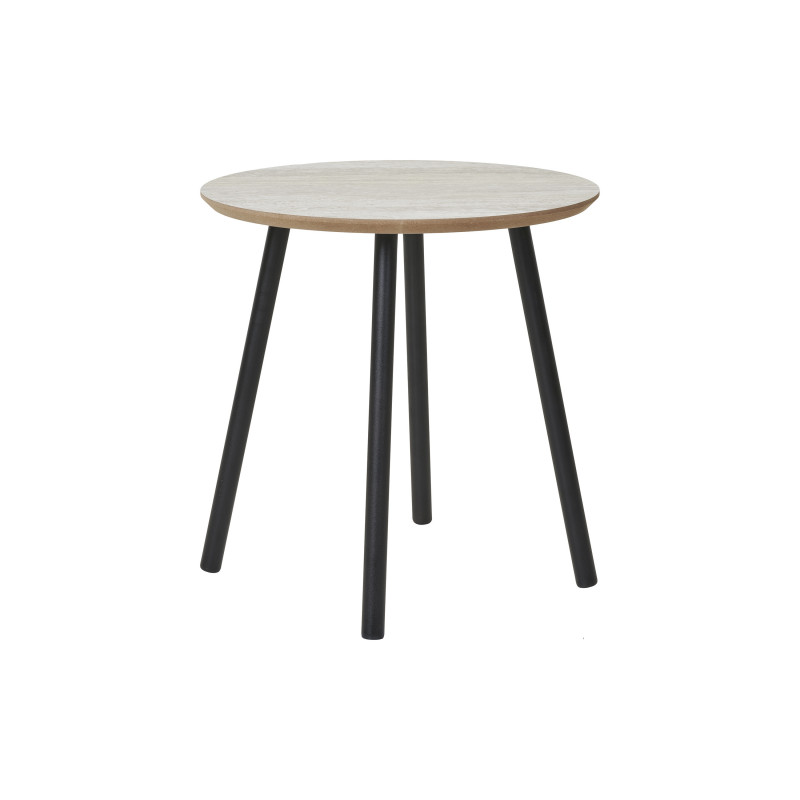 Contrasto ed eleganza. Questo tavolino compatto con effetto travertino aggiunge un tocco sofisticato e minerale. Il piano testurizzato è completato da una base in metallo nero. La combinazione perfetta di materiale e design per un angolo soggiorno di tendenza.