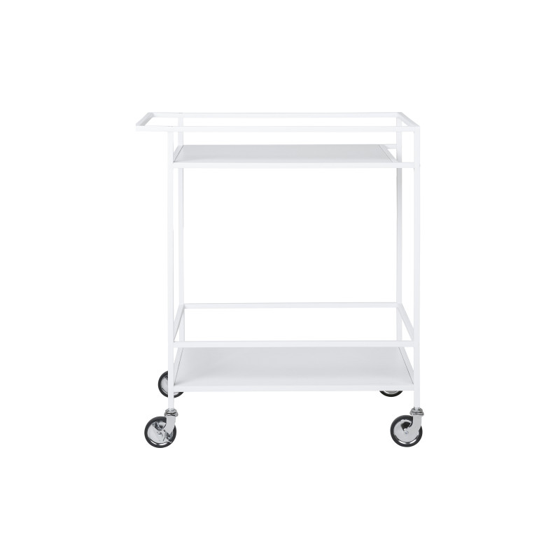 Luminosità pratica. Questo carrello di servizio in metallo bianco dona un tocco di luminosità. Con le sue tre ruote, è ideale per piccoli spazi. La combinazione perfetta di materiale e design per un interno fresco e funzionale.