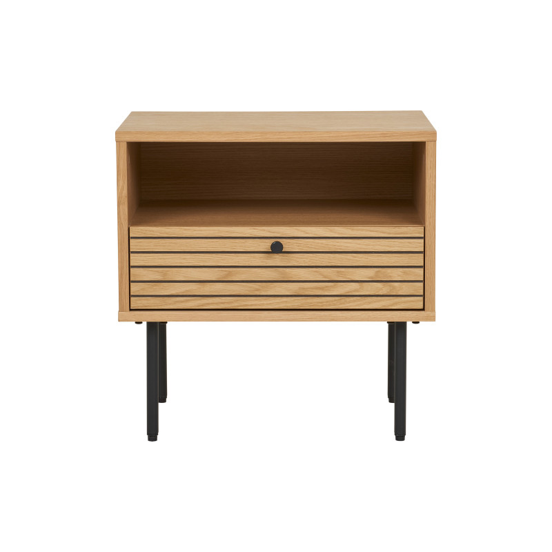Calore e praticità. Questo tavolino in rovere naturale è l'accessorio perfetto per un soggiorno in stile scandinavo. La base in rovere e metallo crea un equilibrio armonioso. La combinazione perfetta di materiale e design per un mobile funzionale.