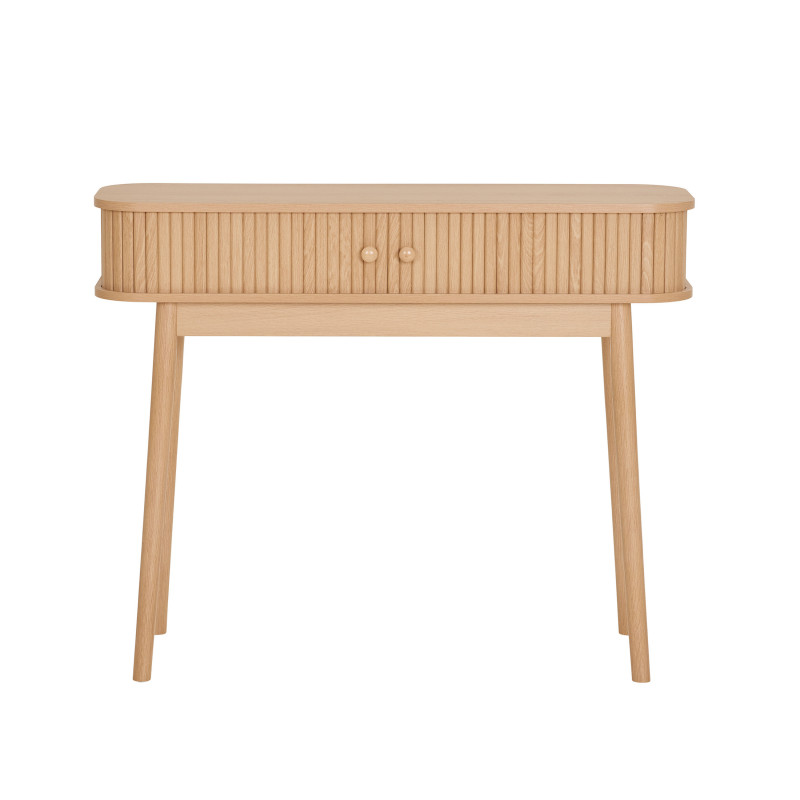 Collezione PERLE: Consolle con finitura in legno naturale Design e raffinatezza. Questa consolle in legno naturale combina un piano in legno impiallacciato con gambe in legno massello. Il suo design semplice e il colore chiaro sono perfetti per un ingresso. Il perfetto mix di materiali e linee per un interno fresco.